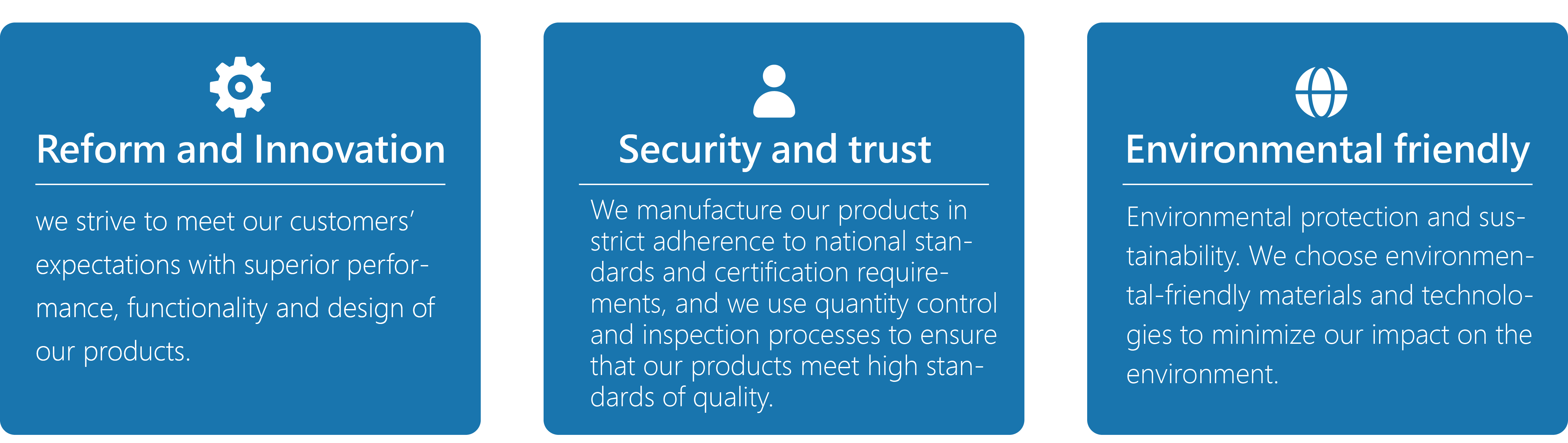 We place great importance on environmental protection, and use environmental-friendly materials and technologies to minimize our impact on the environment. We apply environmental protection concepts in our production processes, and actively participate in environmental protection activities to protect the Earth's resources and natural environments.